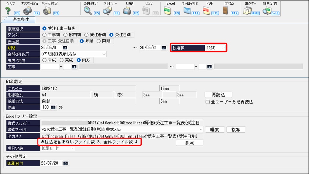 受注工事一覧表の出力設定で、出力パスの下に「税込を含むファイル数」、「全体ファイル数」が表示されていますが、他のPCとファイル数が違うので、同じにできますか。