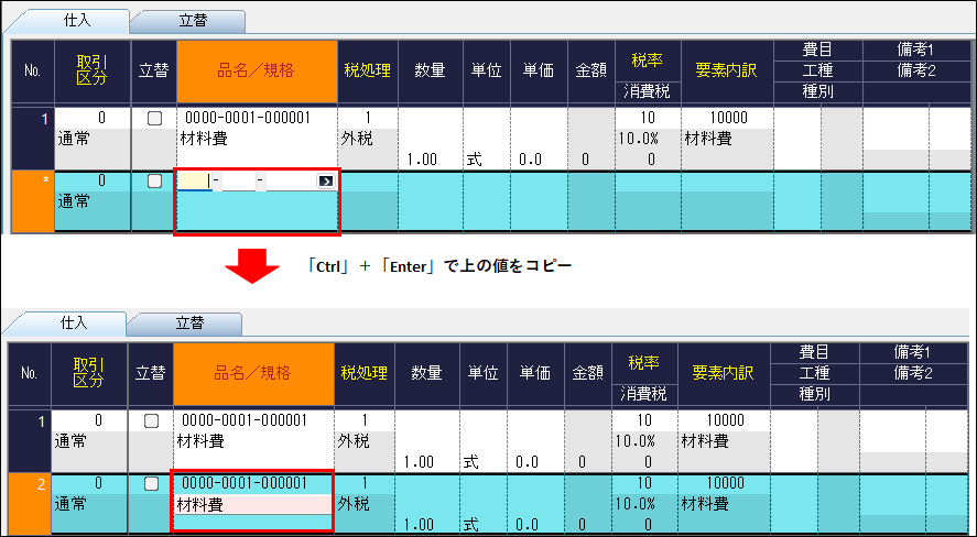 項目をコピーする方法があります。1行目に品名を入れた後、2行目以降、品名項目にカーソルを合わせ、キーボードの「Ctrl」+「Enter」キーを同時に押下していただくと、上の明細と同じ項目の内容をコピーできます。
