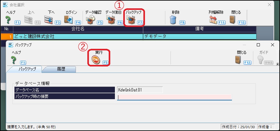どっと原価3では、以下の手順でバックアップの作成を行います。①「ファイル(F)」-「データ選択」の「バックアップ」をクリックします。②「バックアップ」タブで、「実行」をクリックするとバックアップが作成されます。バックアップファイルに摘要を入力したい場合は「バックアップ時の摘要」を入力してください。なお、バックアップを実行すると、クラウド上のストレージにバックアップデータが保存されます。