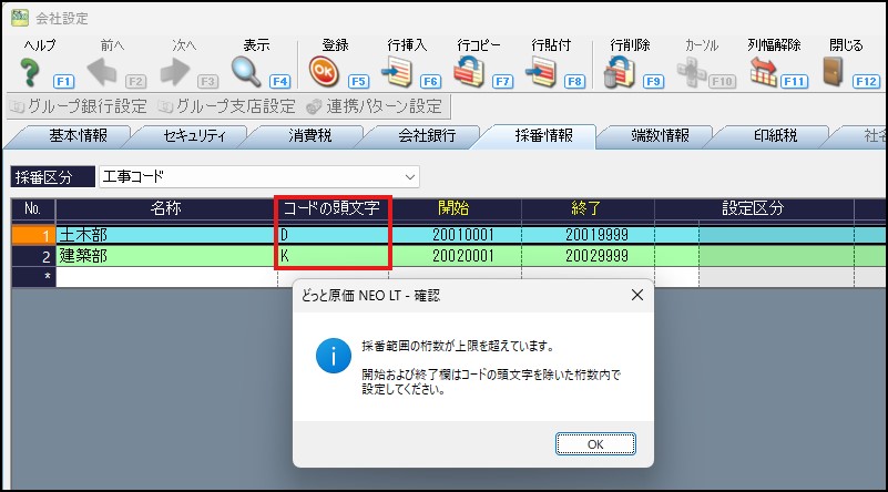 採番情報の登録時に上限桁数を超えていないのに「採番範囲の桁数が上限を超えています。」とエラーメッセージが表示されます。