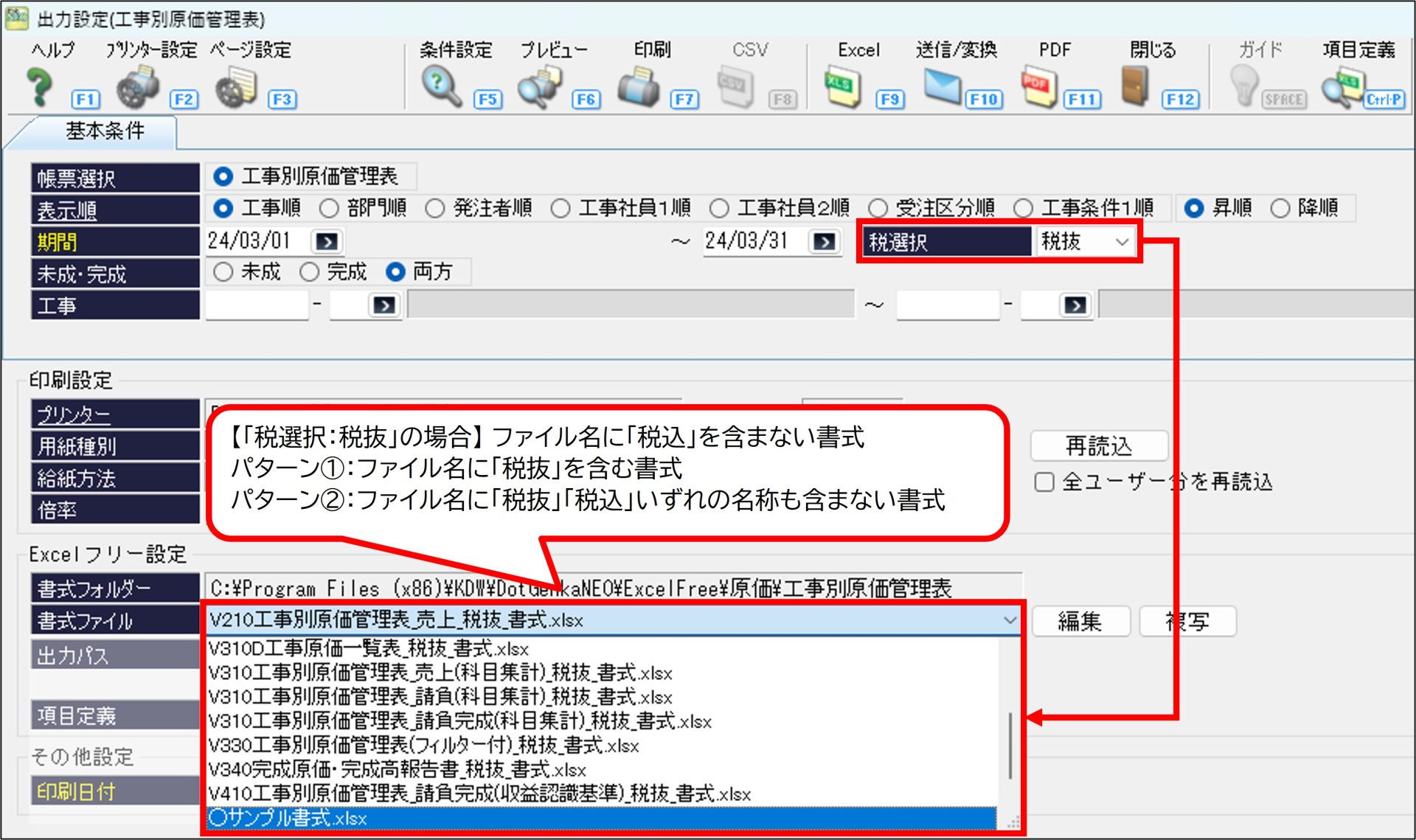「税抜」を選択しているときは、ファイル名に「税込」が含まれない書式(ファイル名に「税抜」が含まれる、あるいはファイル名に「税抜」「税込」いずれも含まれない書式)が表示されます。