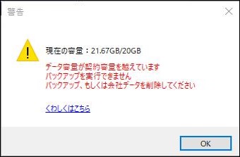データ容量が契約容量を超えている場合は、以下のメッセージが表示され、バックアップを取ることができなくなります。