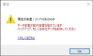 データ容量が契約容量を超えている場合は、以下のメッセージが表示され、バックアップを取ることができなくなります。