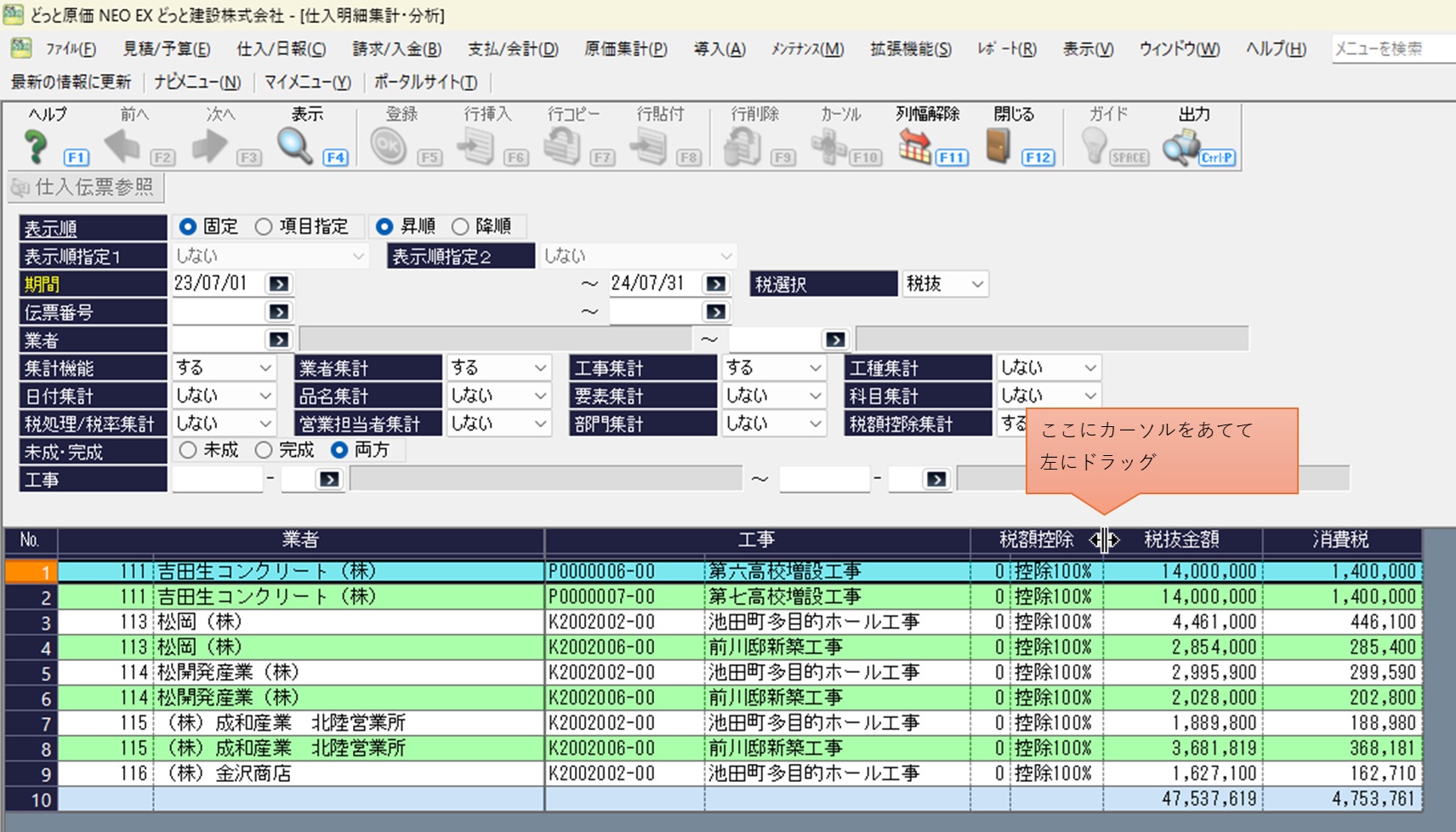 仕入明細集計・分析では、書式の編集は推奨しておりません。入力画面での列幅がそのまま出力される設定となっておりますので、画面上で列幅を縮めて出力してください。