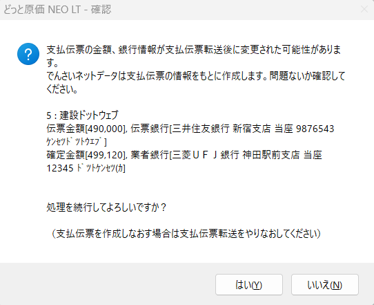 手形・小切手発行から「でんさいネットデータ」を選択し、Txtボタンをクリックしたところ、「支払伝票の金額、銀行情報が支払伝票転送後に変更された可能性があります」という確認画面が表示されました。このメッセージはどういう意味でしょうか。