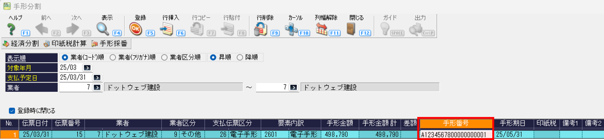 ②手形番号に直接手形番号を入力し、登録ボタンをクリック