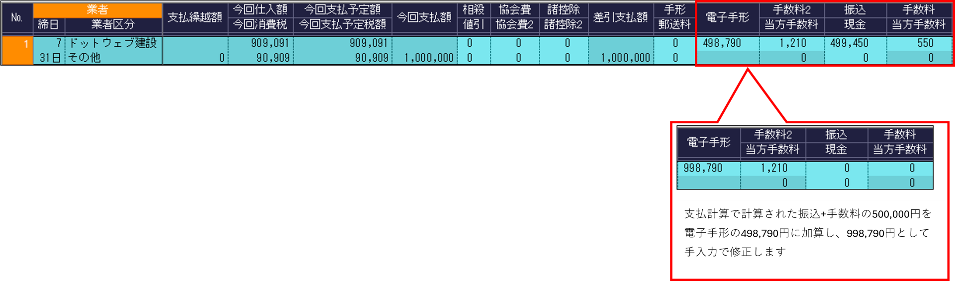 支払査定は通常通り行います。その後、支払確定画面で支払計算を行った後、電子手形で支払いたい業者の電子手形支払額を手動で修正してください。