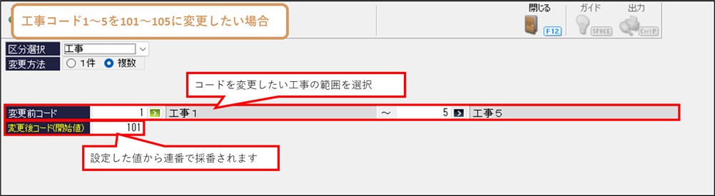 「変更前コード」に変更したい工事の範囲を選択し、「変更後コード(開始値)」に変更後の工事コードの開始の値を設定します。設定したコードより、連番で採番されます。