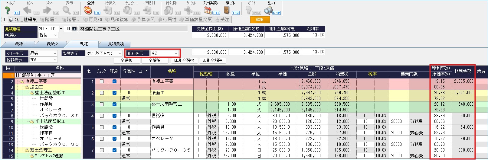 見積入力で明細ごとに粗利率や原価率を確認したいです。