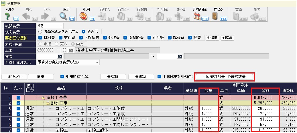 <手順>①引用したい明細にチェックを付けます。②「今回発注数量=予算残数量」ボタンを押します。 数量が入ることにより、金額も自動で表示されます。③「引用」ボタンを押します。
