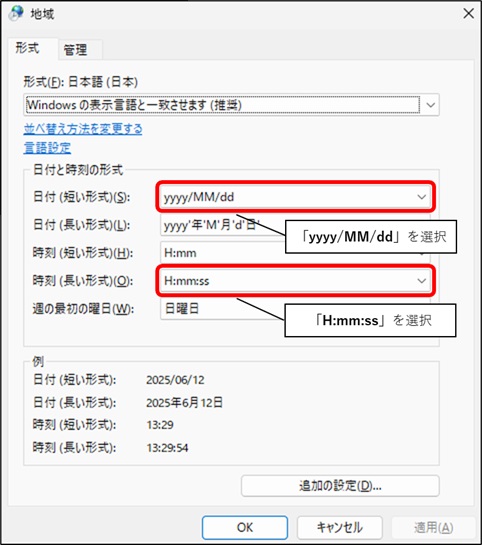 ③「日付(短い形式)」と「時刻(長い形式)」を画像の通りに設定します。