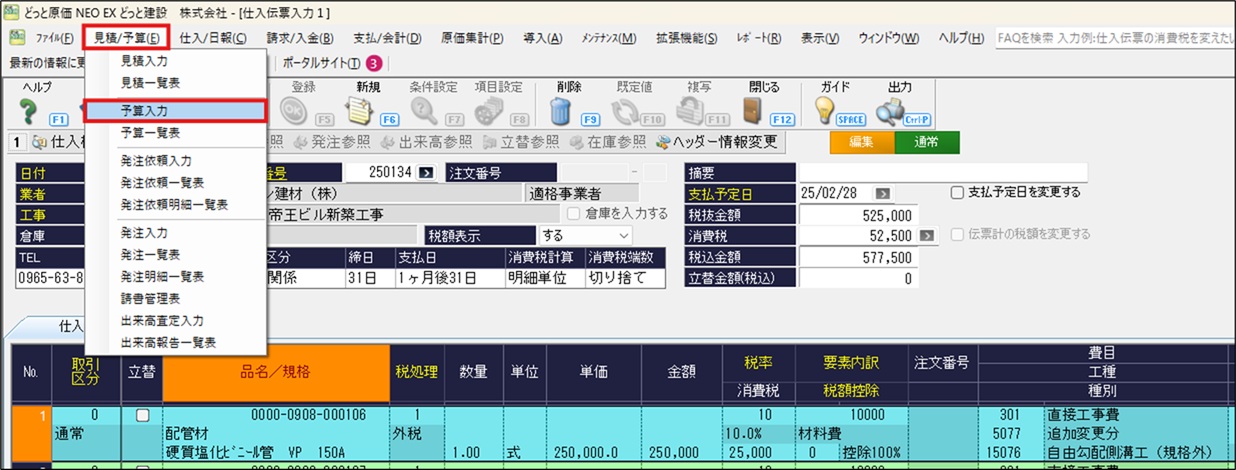 入力中の仕入伝票を閉じずに予算を確認・修正したい場合は、画面上部の 「見積/予算」-「予算入力」 をクリックします。