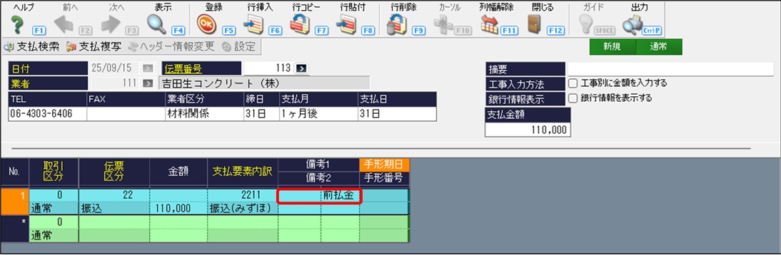 備考欄に「前払金」や工事名などを記載すると、後から見返した際に分かりやすくなります。