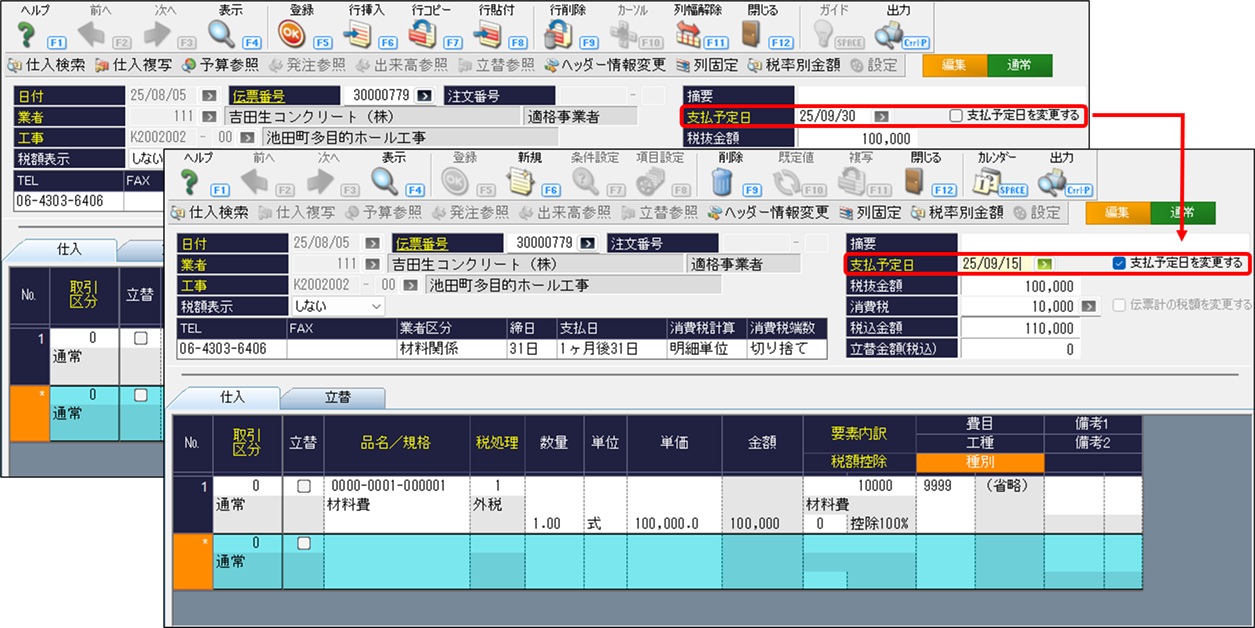 ②作成した仕入伝票の支払予定日を通常の支払分と別日に変更します。