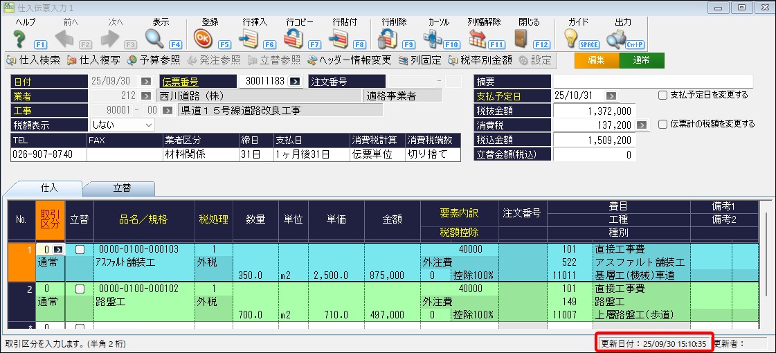 最後に更新した日時は、伝票入力画面にて確認したい伝票を表示させ、画面右下の「更新日付」からご確認いただけます。
