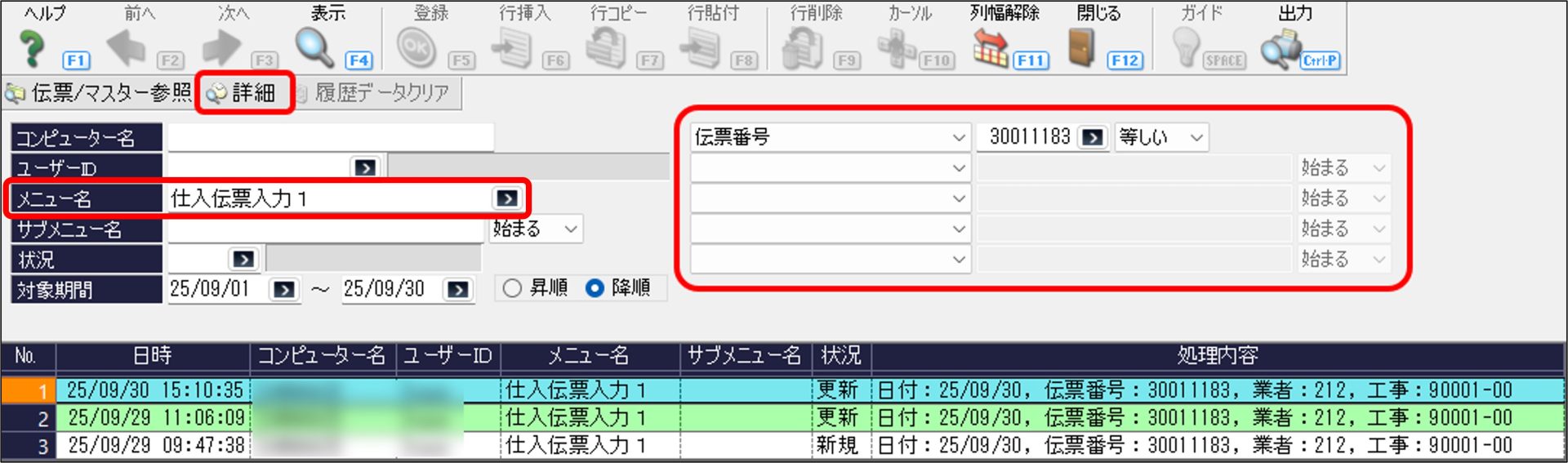 「メニュー名」を確認したい伝票の入力メニュー名に設定します。その他の条件は任意項目なので、わかる部分のみ入力します。画面右上の白いボックスで検索条件を増やすことも可能です。