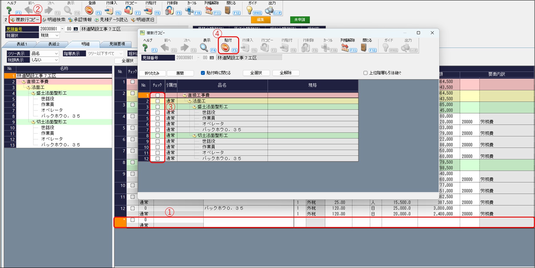 ①コピーした明細を貼り付けたい行を選択します。②サブツールバーの「複数行コピー」をクリックします。※「複数行コピー」がない場合は、右端の「1」をクリックすると表示されます。③コピーしたい行にチェックを付けます。④「貼付」をクリックします。※費目・工種・種別も貼り付けたい場合、「上位階層も引き継ぐ」にチェックを付けます。