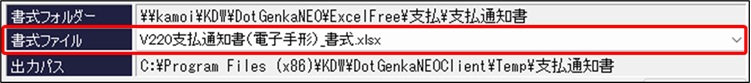 出力設定画面で、「支払通知書(電子手形)_書式」の書式ファイルを選択していただくことで、電子手形の情報があらかじめ表示されます。