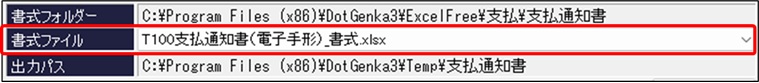 出力設定画面で、「支払通知書(電子手形)_書式」の書式ファイルを選択していただくことで、電子手形の情報があらかじめ表示されます。