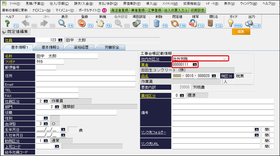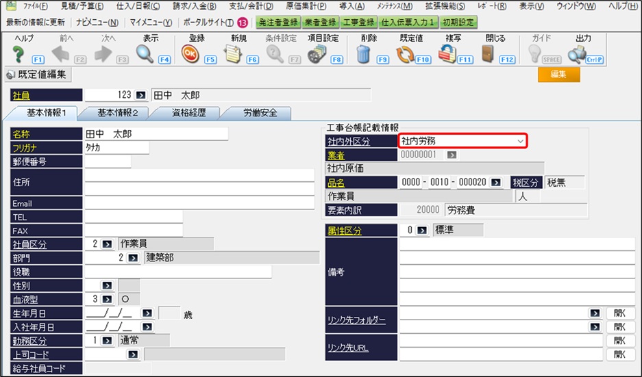自社社員・外注先の社員どちらも、「社員登録」から登録します。登録時に、「基本情報1」タブの「社内外区分」で区分を設定してください。