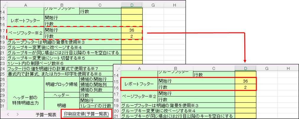 ①変更したいExcel書式を選択し、起動します。②「印刷設定値」シートを開きます。③「ページフッター」に入力されている数値を消し、「レポートフッター」へ入力します。※予算一覧表を例にしています