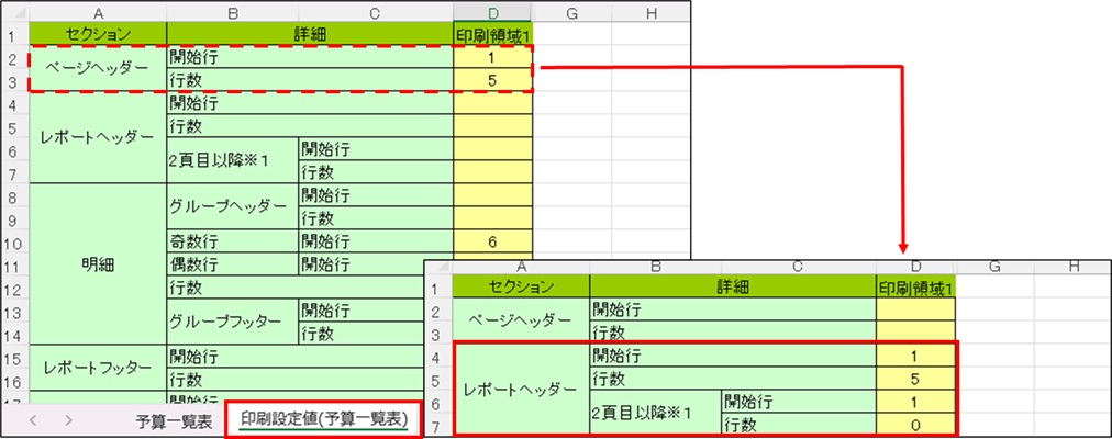 ①変更したいExcel書式を選択し、起動します。②「印刷設定値」シートを開きます。③「ページヘッダー」に入力されている数値を消し、「レポートヘッダー」へ以下のように入力します。開始行・行数:1ページ目に表示させるヘッダー2頁目以降(開始行):2ページ目以降に表示させる開始行2頁目以降(行数):「0」と入力※予算一覧表を例にしています