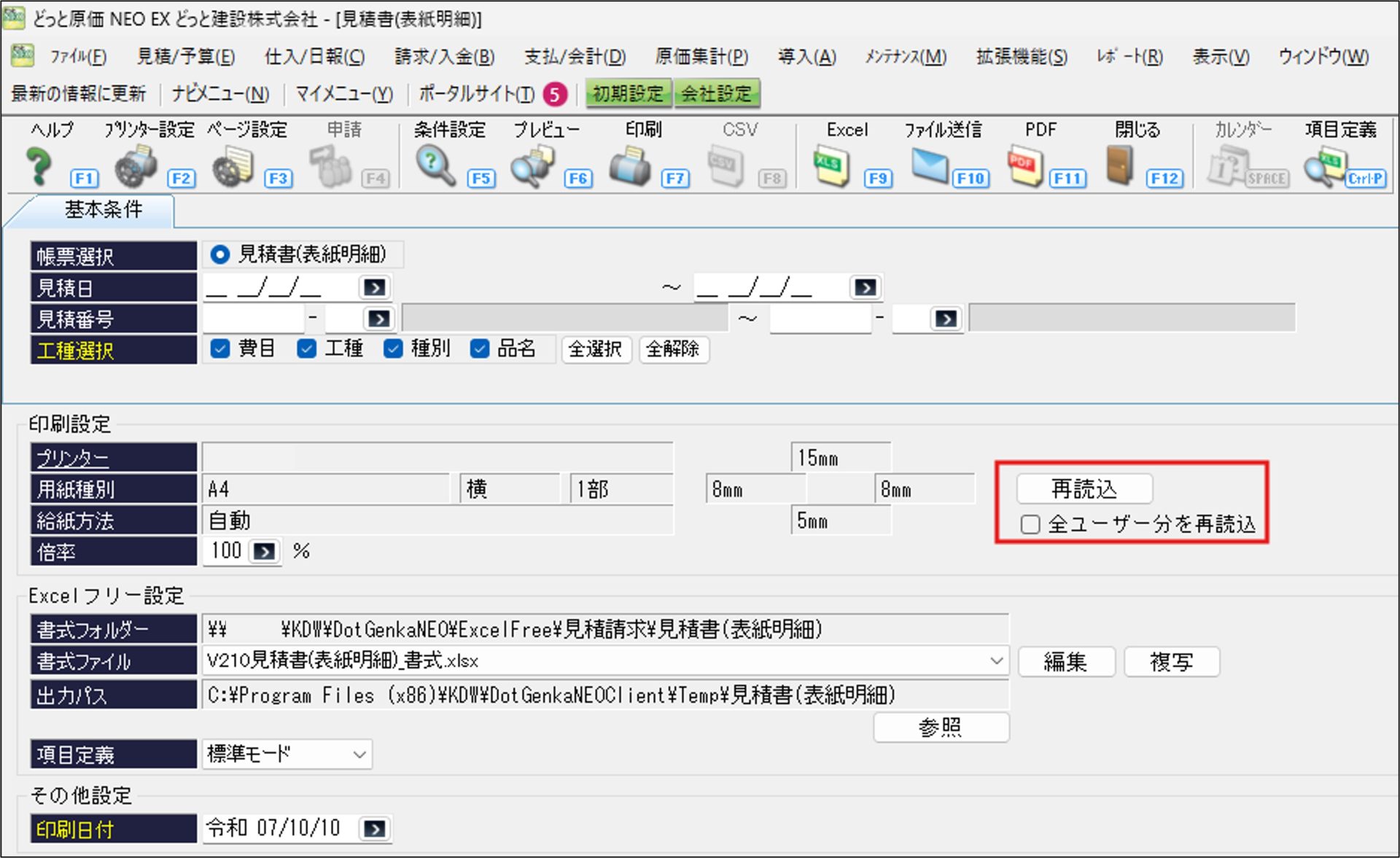 「再読込」をすることで、Excel書式の余白、倍率が反映されます。