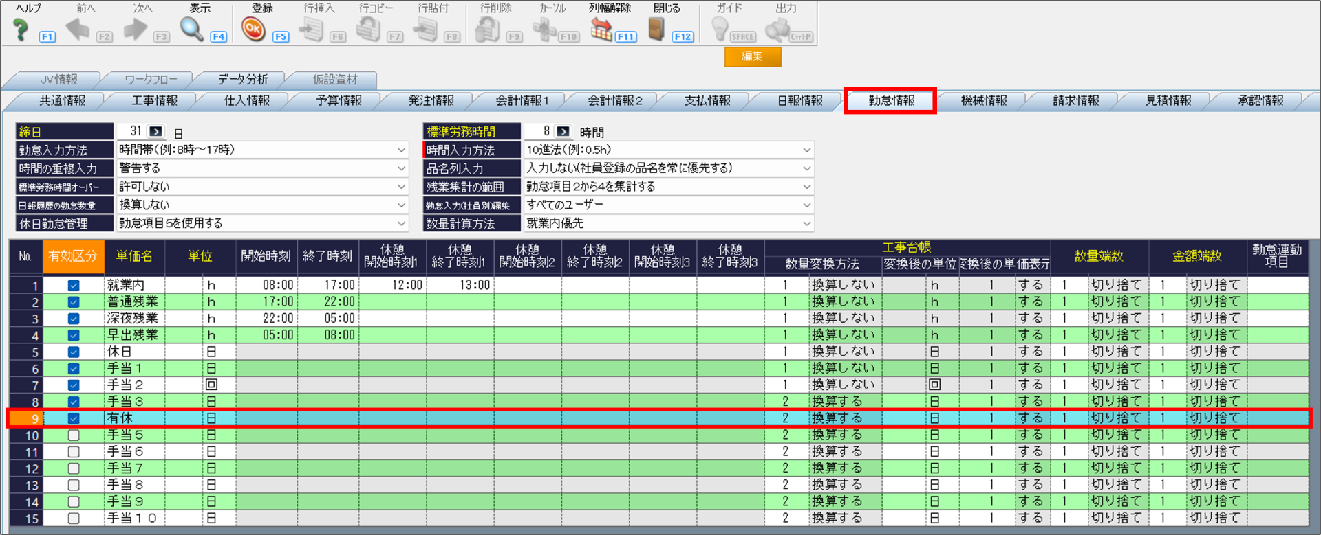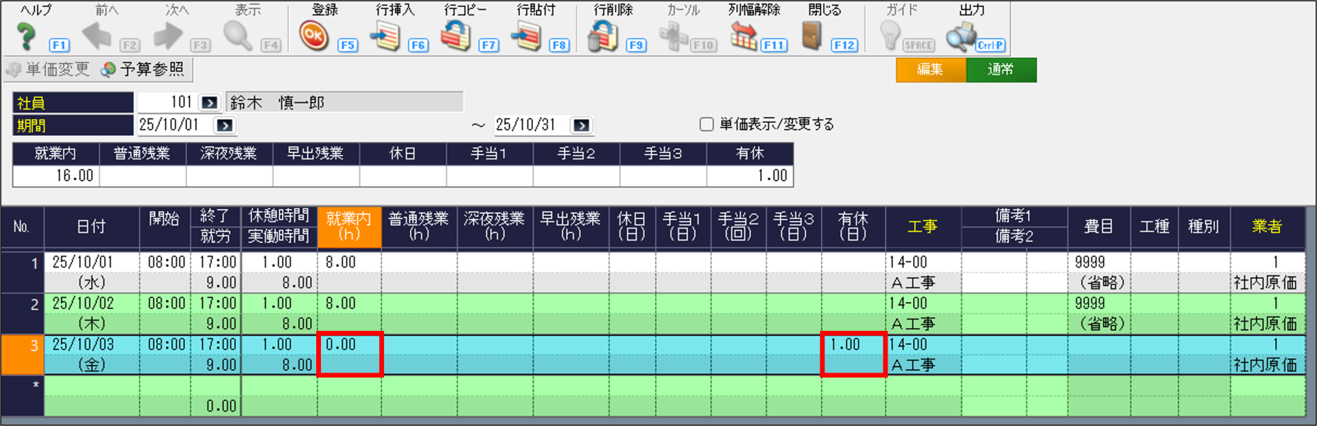 ⑥「就業内」に0、「有休」に1を入力します。そうすることで、有休の単価で集計されます。