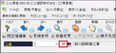 2.[初期設定]-『工事情報』の「枝番管理」が「親は枝番00固定(枝番時00使用不可)」の場合