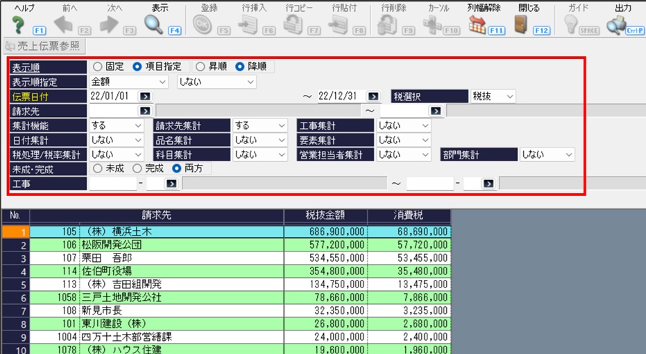 ①[ナビメニュー]-[請求売上]-[売上明細集計・分析]を開きます。②表示順を「項目指定」、「降順」にします。③表示順指定を「金額」にします。④任意の集計期間を指定します。⑤集計機能を「する」にし、請求先集計も「する」に切り替えます。⑥最後に「表示」アイコンをクリックします。期間内の売上金額が大きい順に表示されます。