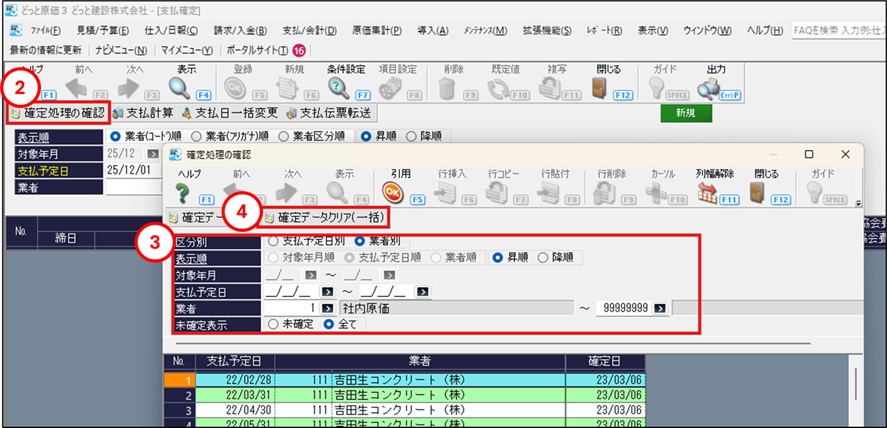 ①「支払管理」-「支払確定」を開きます。