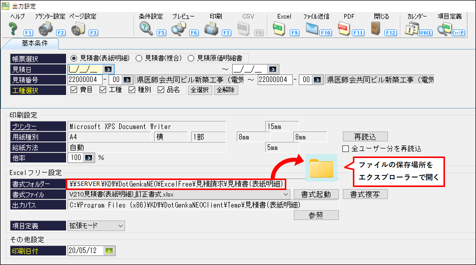 どっと原価NEOでは、「出力設定」画面の「Excelフリー設定」にExcel書式が保存されている「書式フォルダー」が表示されています。