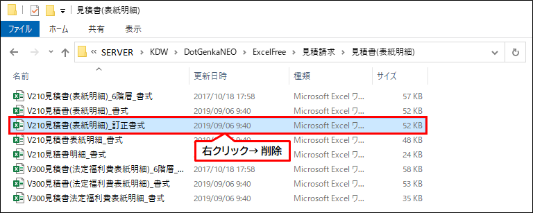 表示されているExcel書式の保存場所をエクスプローラーで開き、Excel書式を削除することで、書式ファイルの選択から削除されます。尚、Excel書式を削除する前に、誤って削除した時に元へ戻せるようにExcel書式の「バックアップ」をお勧めいたします。