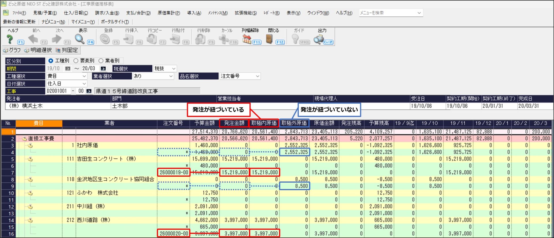 「仕入明細」の「注文番号」が「*」の場合は、すべて「取極外原価」に含まれます。