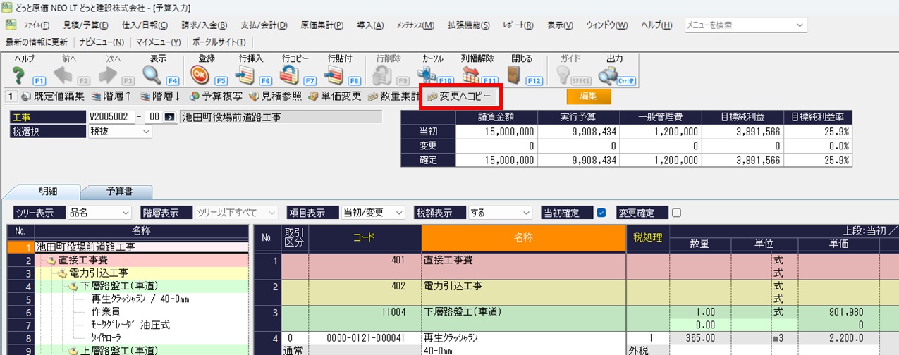 「変更へコピー」し、金額の変更、項目の追加を行います。