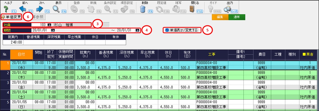 ③[勤怠入力]で、手順②で品名を変更した社員を選択します。