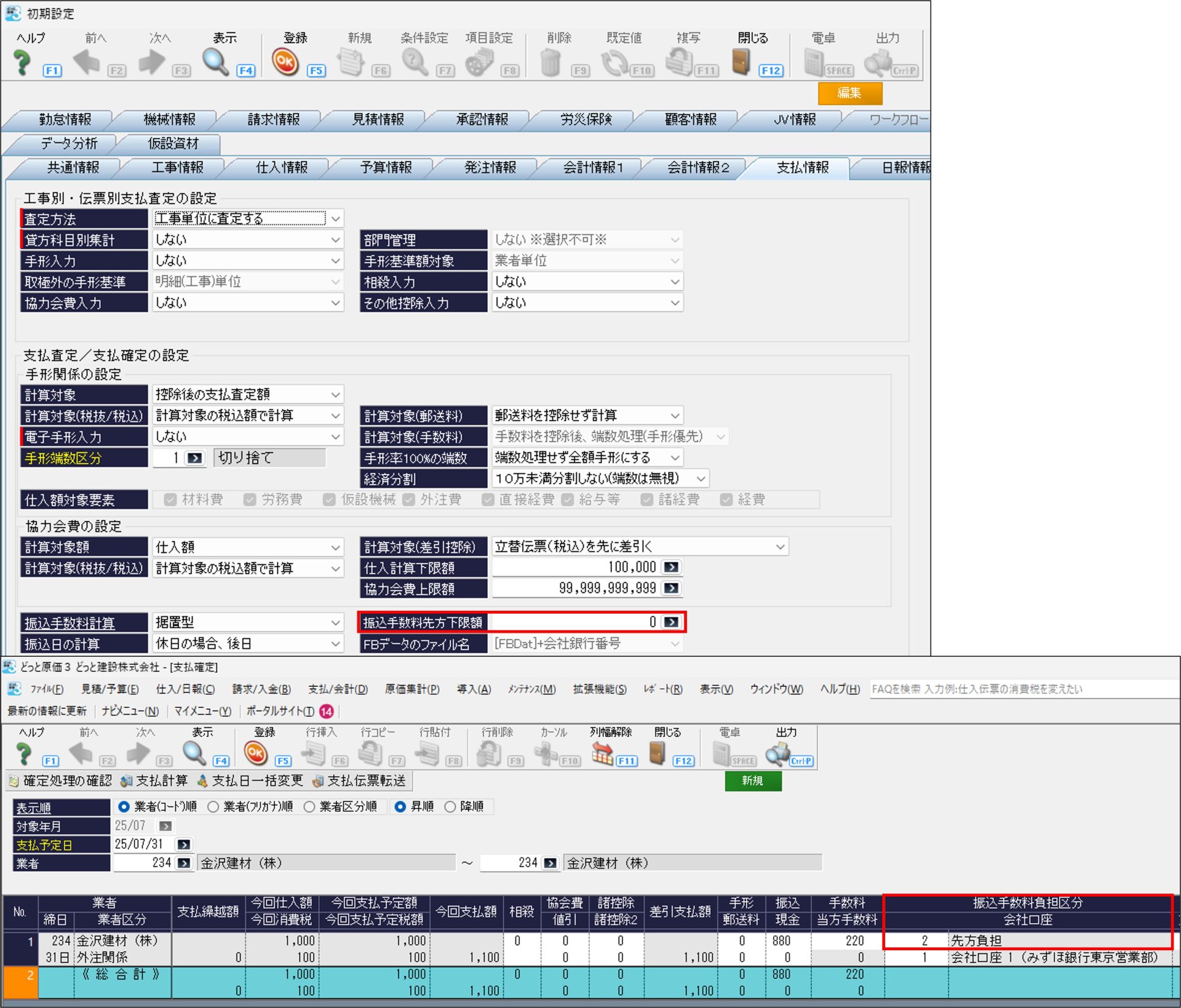 「支払確定」画面で振込金額が、「初期設定」-「支払情報」の「振込手数料先方下限額」を下回る場合は、当方負担になります。