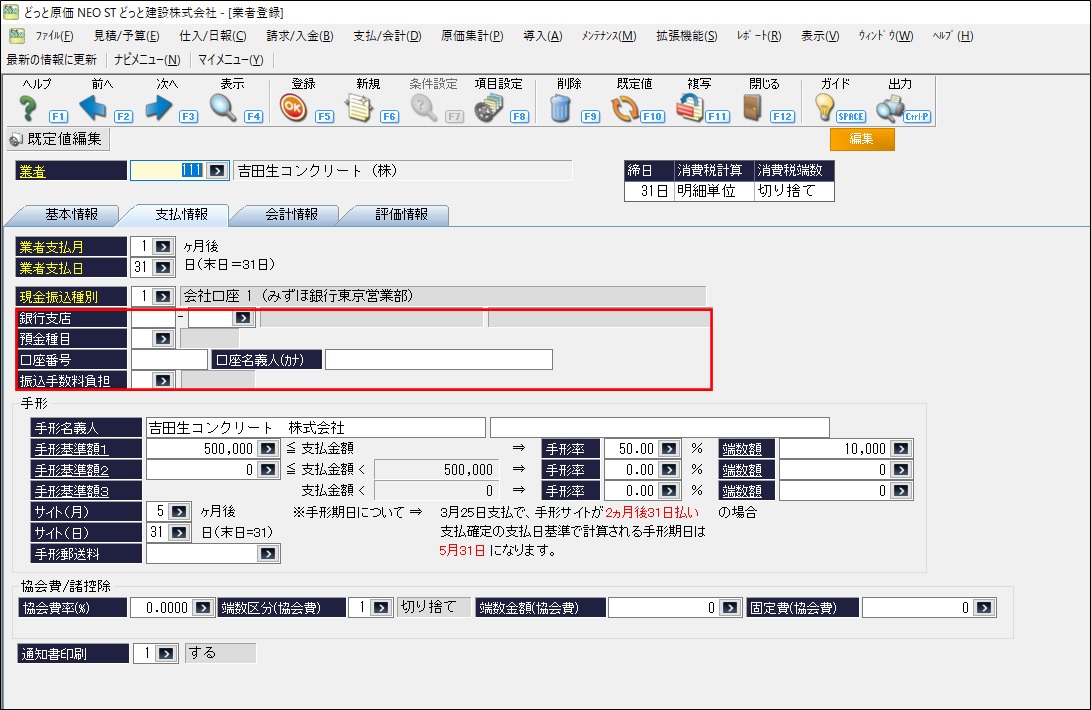 「業者登録」-「支払情報」の「現金振込種別」が「振込」と設定していても、銀行支店等の情報が登録されていない場合に現金扱いとなります。