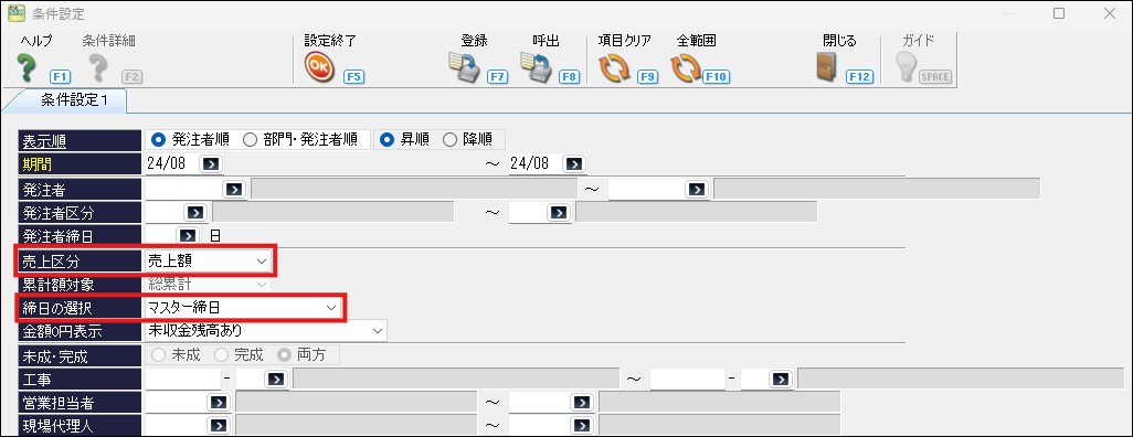 「売掛残高一覧表」の「条件設定」で「売上区分」を「売上額」、「締日の選択」で「マスター締日」を選択いただくと、締日毎の絞込で表示できます。