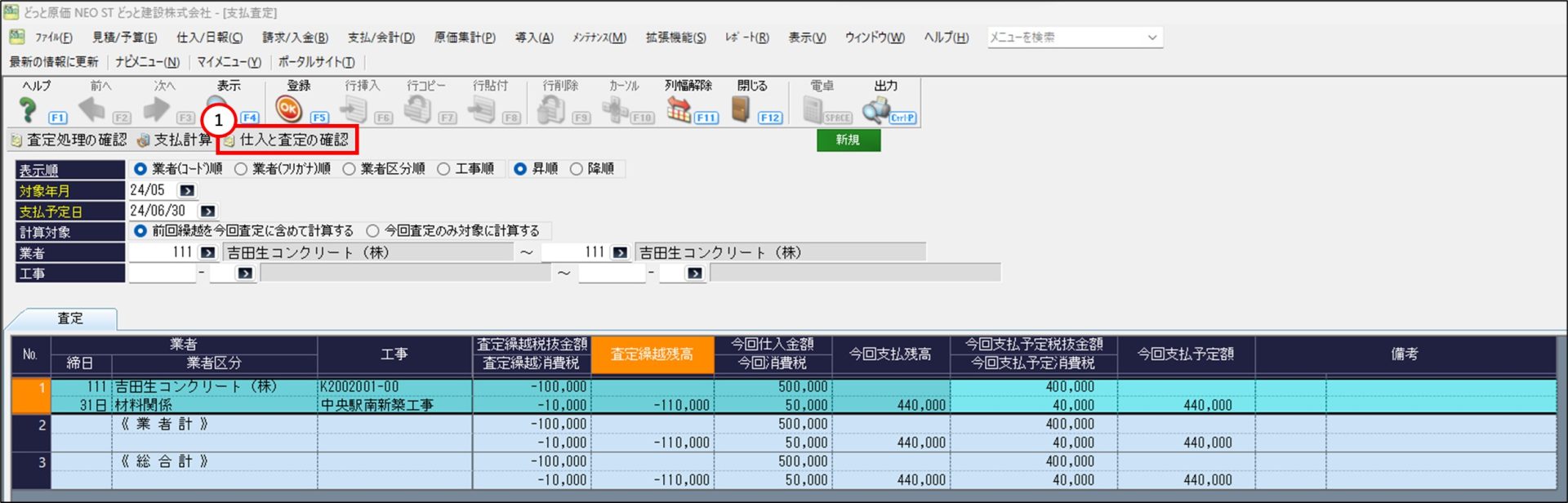 対象年月、支払予定日までの仕入額よりも支払査定額の方が多い状態の場合に査定繰越残高がマイナスになります。